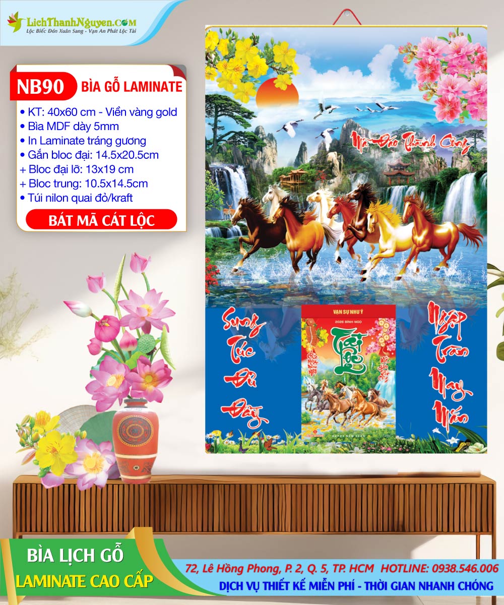 Mã Số: NB90 – Bìa Lịch Gỗ (40×60) Laminate – Bát Mã Cát Lộc