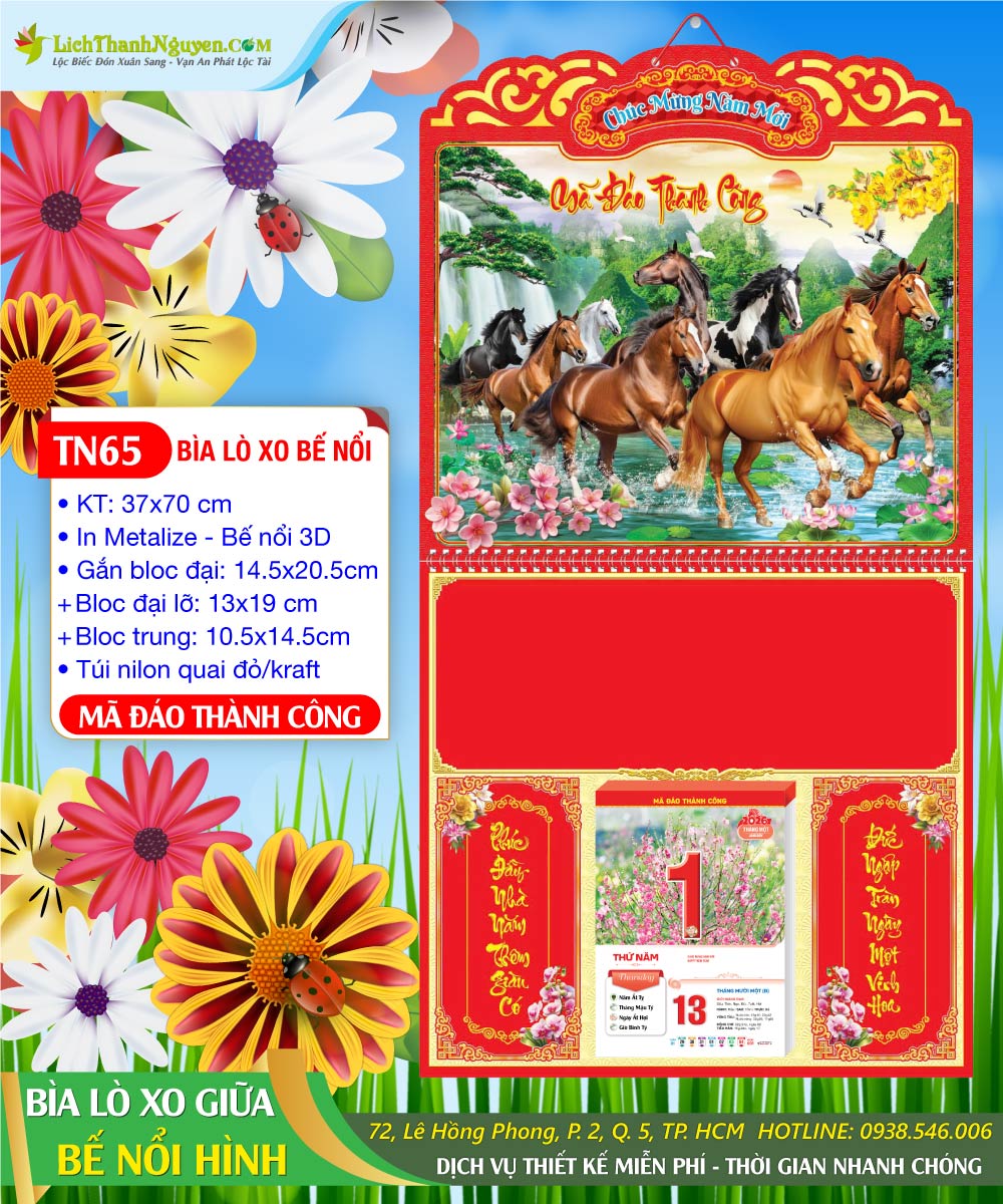 Bìa Lò Xo Giữa Bế Nổi Mã Đáo Thành Công là một sản phẩm lịch treo tường gắn bloc. Kích thước phủ bì của loại bìa này là (37×70cm), thường được làm từ bìa carton dày 3mm chất lượng in metalize chiết quang hologam 7 màu, cán màng để tăng độ bền và vẻ đẹp. Kỹ thuật bế nổi hiệu ứng 3D giúp tạo hiệu ứng hình ảnh nổi bật, với các chi tiết chính được làm gờ lên từ 0.5cm trên bề mặt, tạo sự sinh động và thu hút.
