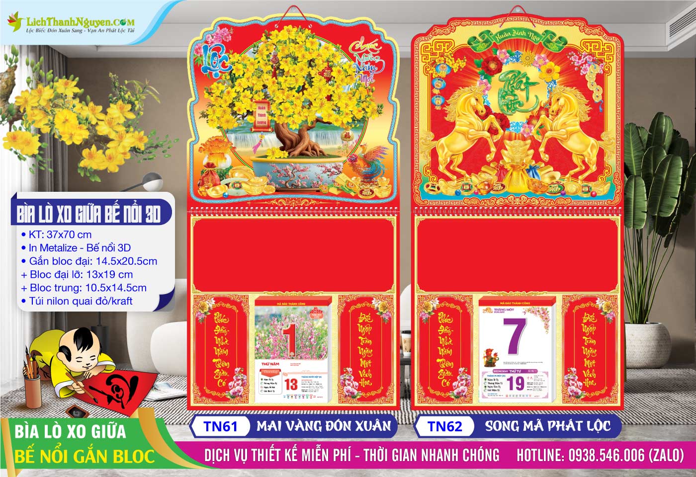 Bìa Lò Xo (37x70cm) Bế Nổi 3D là một sản phẩm lịch tết thiết kế khá tinh tế và sang trọng, thích hợp như 1 bức tranh trang trí trong không gian phòng khách của gia đình. Bìa có khánh treo in metalize chiết quang 7 màu, Bế nổi 3D. Đây là món quà ý nghĩa dành tặng người thân, bàn bè trong dịp năm mới, thể hiện sự trân trọng và chúc phúc cho một năm mới an khang thịnh vượng.