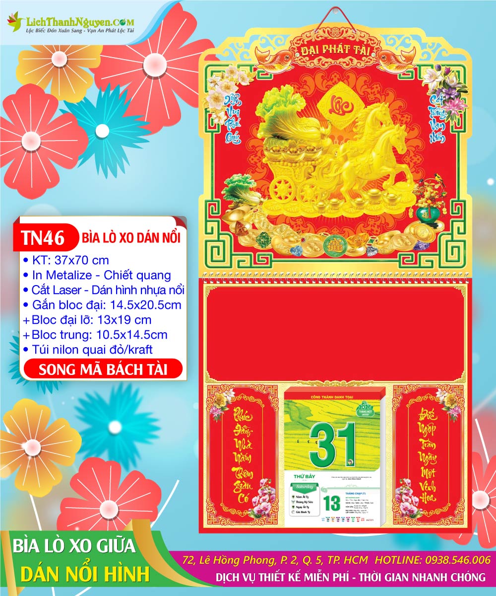 Bìa Lò Xo Giữa Dán Nổi Song Mã Bách Tài là mẫu lịch treo tường gắn bloc có lò xo giữa dễ dàng gấp gọn lại, mẫu bìa lịch truyền thống dán hình xi vàng 3D nổi sang trọng, đang được phân phối tại Lịch Tết Sài Gòn Q.5 – ĐT: 0938.546.006 Zalo – ĐC: 72 Lê Hồng Phong, P.2, Q.5