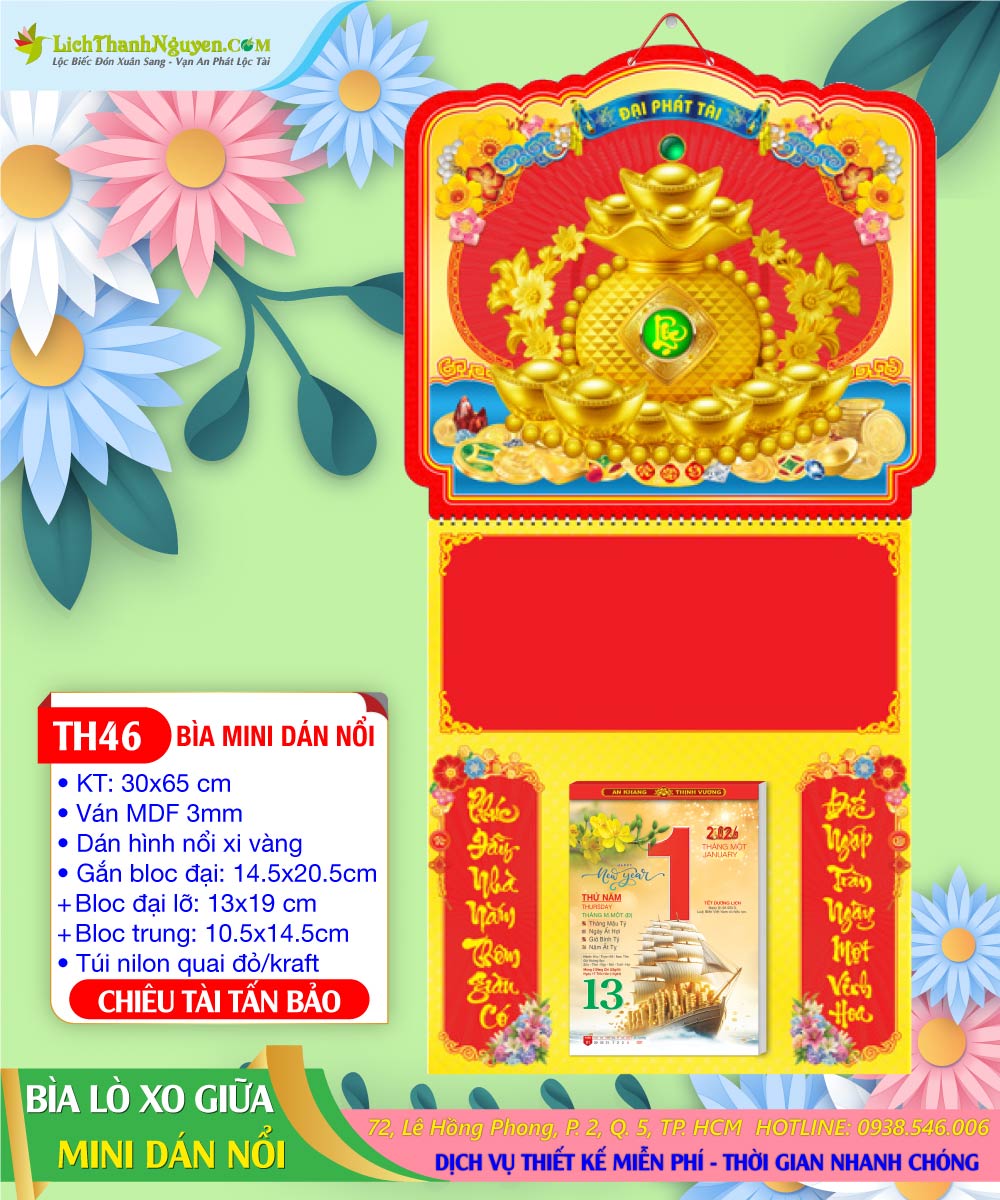 Bìa Lò Xo Mini Dán Nổi Chiêu Tài Tấn Bảo được phân phối tại Lịch Thanh Nguyên, đây là mẫu lịch treo tường, bìa gắn lò xo dễ gập lại, gắn bloc lịch rời ở giữa. Bìa Lò Xo Mini Dán Nổi 3D Thanh Nguyên 2026 thị trường có nhiều hình nổi xi vàng và hình nổi cẩm thạch tự chọn, mẫu Bìa lò xo mini dán nổi 3D treo được nhiều quý doanh nghiệp làm quà tặng cuối năm. Liên hệ: 0938.546.006 (Zalo/Viber) – ĐC: 72 Lê Hồng Phong, Phường 2, Quận 5, TP. HCM.