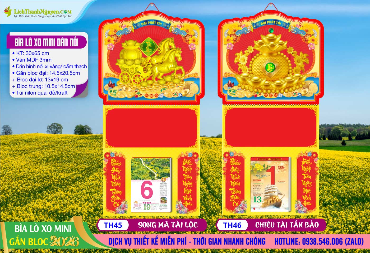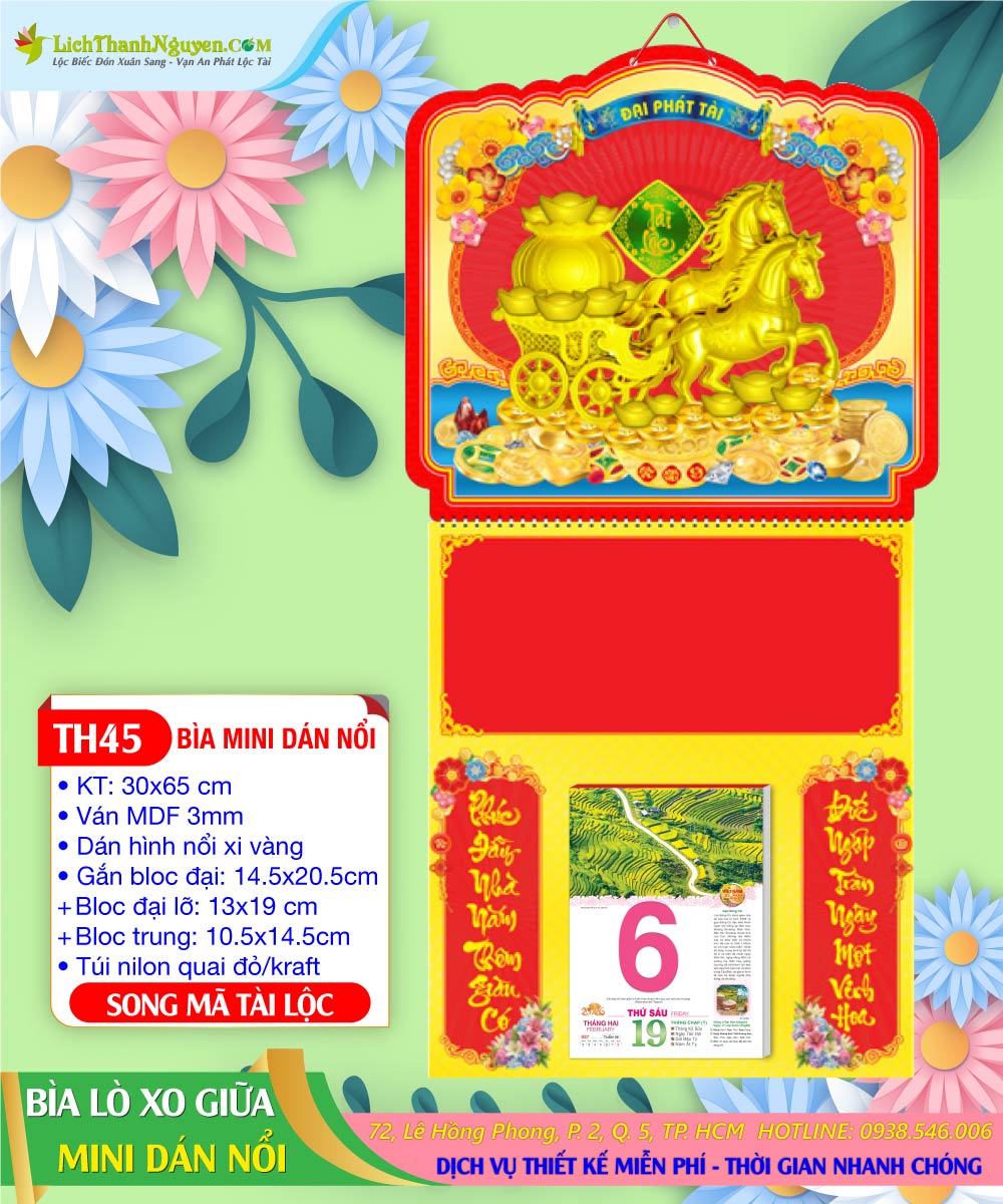 Bìa Lò Xo Mini Dán Nổi Song Mã Tài Lộc được phân phối tại Lịch Thanh Nguyên, đây là mẫu lịch treo tường, bìa gắn lò xo dễ gập lại, gắn bloc lịch rời ở giữa. Bìa Lò Xo Mini Dán Nổi 3D Thanh Nguyên 2026 thị trường có nhiều hình nổi xi vàng và hình nổi cẩm thạch tự chọn, mẫu Bìa lò xo mini dán nổi 3D treo được nhiều quý doanh nghiệp làm quà tặng cuối năm. Liên hệ: 0938.546.006 (Zalo/Viber) – ĐC: 72 Lê Hồng Phong, Phường 2, Quận 5, TP. HCM.