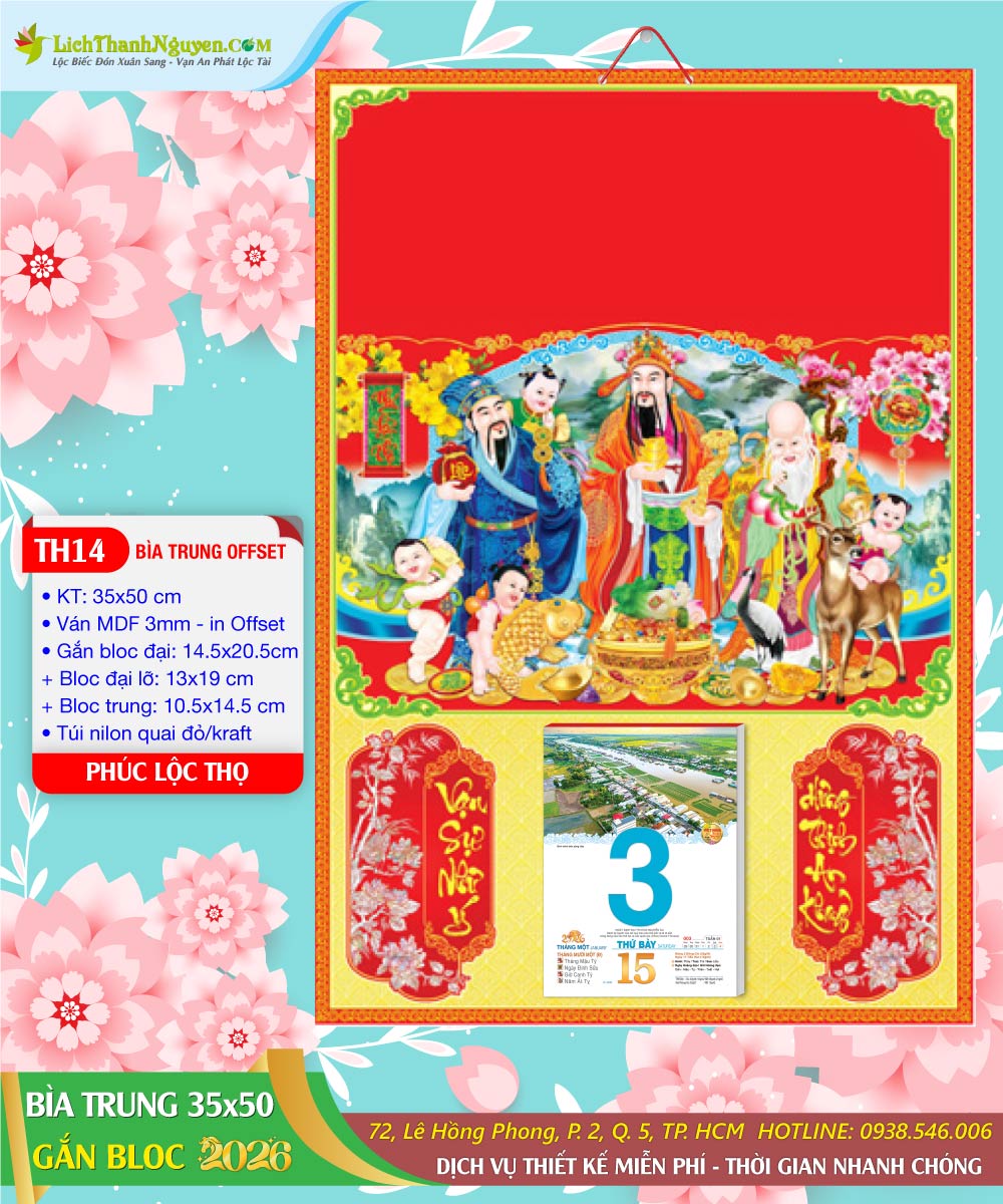 Bìa Trung 35×50 Phước Lộc Thọ gắn bloc trung 10x15cm có nhiều mẫu: Mai Vàng, Di Lặc, Phước Lộc Thọ, Thuyền Buồm, Phát Tài. Bìa Trung (35x50cm) in máy offset 4 màu cao cấp theo thiết kế đã cấp phép và ấn hành xuất bản, Nhãn in offset trên giấy Couche, cán màng mờ, bồi trên ván MDF 2.5ly, chắc chắn và không cong.