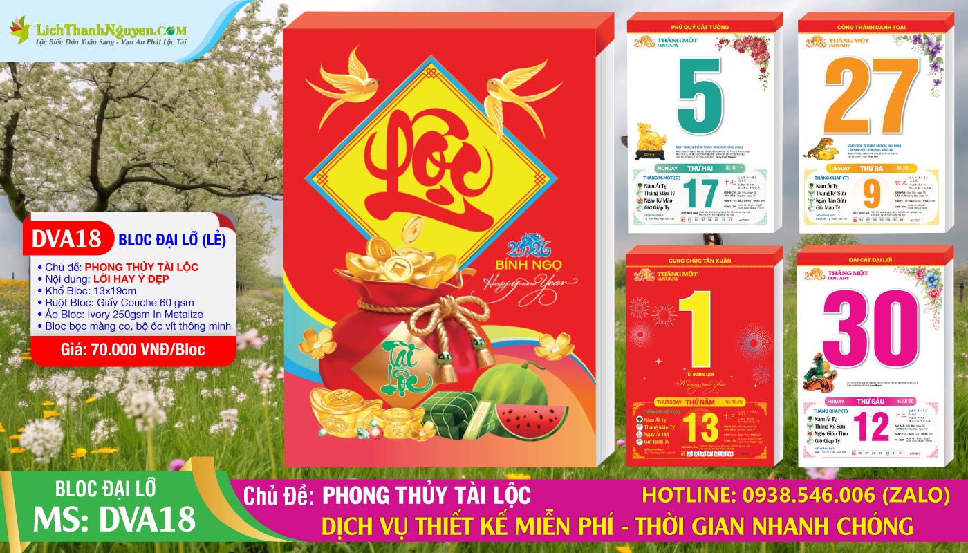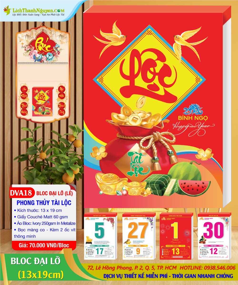 Lịch Bloc Đại Lỡ 2026 đóng 1 thùng x 25 Bloc Chiết khấu 63-65% (tuỳ theo thời điểm biến động thị trường) Đc: 72 Lê Hồng Phong, P.2, Q.5 – ĐT: 0938.546.006 Zalo. Hàng luôn có sẵn đáp ứng đặt hàng 24/7. Bloc Đại Lỡ Phong Thuy Tài Lộc là một sản phẩm lịch tết được sử khá đa dạng để gắn cho tất cả các loại bìa lịch tết như : Bìa lò xo, bìa đại 40×60, bìa laminate, bìa phù điêu, bìa gập khung vàng….