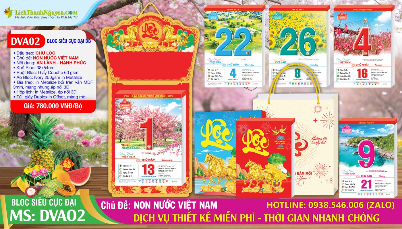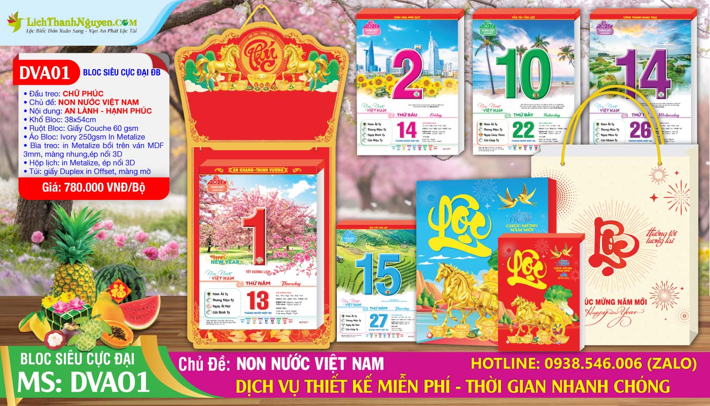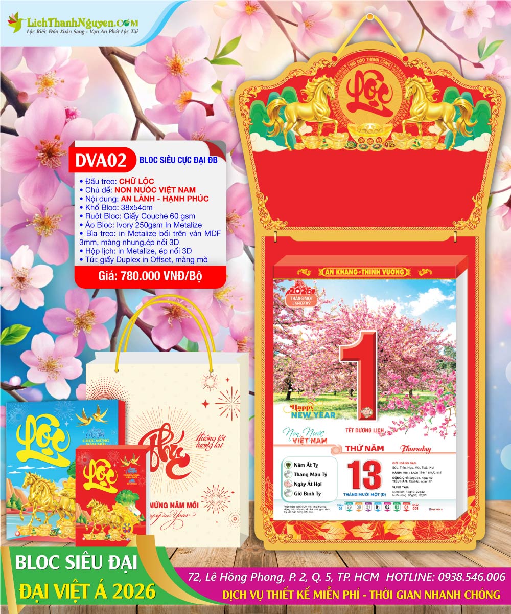 Bloc Siêu Cực Đại Đặc Biệt Đại Việt Á trọn bộ: khánh treo, đế lưng, bloc lịch 365 tờ, hộp giấy, túi giấy, bộ ốc gắn lịch mạ vàng 24K. Giá đang được tài trợ chiết khấu 30-40% từ NBX ĐVÁ. Mua Sỉ và Lẻ tại Đc: 72 Lê Hồng Phong, P.2, Q.5 – ĐT: 0938.368.718